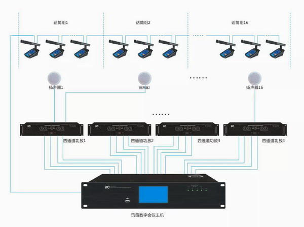 itc訊笛數(shù)字會(huì)議系統(tǒng)可連接16路功放和16個(gè)揚(yáng)聲器組,能夠有效提高會(huì)場(chǎng)的傳聲增益而不發(fā)生嘯叫。如上圖所示:將會(huì)場(chǎng)按物理位置分成16個(gè)區(qū)域,每個(gè)區(qū)域內(nèi)對(duì)應(yīng)有一組揚(yáng)聲器;每個(gè)區(qū)域內(nèi)的話筒作為一個(gè)分組,對(duì)應(yīng)會(huì)議控制主機(jī)的一個(gè)分組輸出。