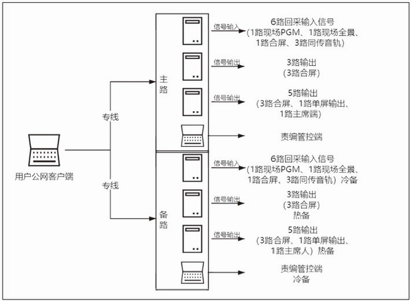軟件的系統(tǒng)架構(gòu)為主、備兩路,如圖3所示,以保障系統(tǒng)的安全運(yùn)行。其中,每路設(shè)有2臺輸出服務(wù)器,1臺用于輸出3路3×3畫面的合屏信號,1臺用于輸出3路3×3畫面的合屏信號、1路單屏信號及1路線上主席端的信號;1臺輸入服務(wù)器輸入1路現(xiàn)場畫面PGM信號、1路現(xiàn)場全景、1路合屏、3路同傳音軌;并且使用1臺計(jì)算機(jī)用于責(zé)編的后臺管控,以保證會議進(jìn)行時(shí)后端能夠?qū)崟r(shí)觀察到網(wǎng)絡(luò)情況及各客戶端的相應(yīng)數(shù)據(jù),且能夠以最高權(quán)限管控會議期間無人亂入。