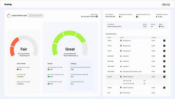TesiraFORTÉ X具有Biamp Launch自動調(diào)試功能,允許一鍵式房間硬件發(fā)現(xiàn)、配置和調(diào)試。在啟動過程完成后,可通過網(wǎng)絡(luò)瀏覽器查看調(diào)試報告,報告內(nèi)容提供房間的聲學(xué)性能在調(diào)試之前與調(diào)試之后區(qū)別,生成Biamp硬件清單。生成的報告可以打印。