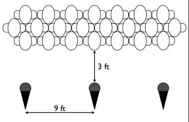 大合唱擺位有多種方式今天只介紹一簡單實用的平衡多點式擺放法,對于用一支傳聲器拾取聲源的情況,建議將傳聲器置于第一排人員前上方正中央,并指向最后一排。在這樣的設置中,對于排成矩形或楔形的合唱隊,單只心型指向范圍話筒可覆蓋15~20個人聲。對于人數(shù)更多或排成其他形狀的合唱隊,可能需要多支傳聲器。傳聲器的拾音角度就是其指向性功能(心型傳聲器為130°),因此,需要將傳聲器放置到更遠的位置來獲取更寬的覆蓋范圍。遵守3:1規(guī)則。