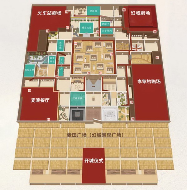 在這座戲劇幻城內(nèi),為觀眾呈現(xiàn)的是全景式全沉浸戲劇表演。該項目以麥田景觀為背景和烘托,劇情以“黃河、土地、糧食、傳承”為主線,在三大主劇場(李家村劇場、幻城劇場、火車站劇場)呈現(xiàn)以血脈親情與民族大義為主題的戲劇故事,演繹河南人的血脈傳承與上下千年;在微劇場及情景空間則以河南歷史、鐵路、工業(yè)、農(nóng)耕、繁衍等為主題,通過人景互動切換生動闡釋“幻城”概念。
