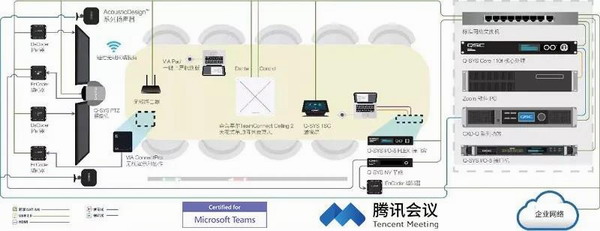 綜合會(huì)議系統(tǒng)解決方案采用QSC Core數(shù)字音頻處理器作為核心管理系統(tǒng), QSC CX-Q網(wǎng)絡(luò)數(shù)字功放、QSC AD-S系列壁掛揚(yáng)聲器以及森海塞爾TeamConnect Ceiling 2天花式吊頂陣列麥克風(fēng)、NV-32-H網(wǎng)絡(luò)視頻設(shè)備、Kramer無(wú)線協(xié)助系統(tǒng)構(gòu)建一整套多功能綜合會(huì)議解決方案。佳聯(lián)綜合會(huì)議系統(tǒng)解決方案現(xiàn)已通過(guò)Microsoft Teams認(rèn)證,使Q-SYS生態(tài)系統(tǒng)與其完美兼容,F(xiàn)支持成一鍵入會(huì)、一鍵參會(huì)等功能。并且大大簡(jiǎn)化了用戶對(duì)會(huì)議室控制操作流程。最終達(dá)成只需一個(gè)控制器即可控制整個(gè)會(huì)議室。除Microsoft Teams以外,綜合會(huì)議系統(tǒng)解決方案還通過(guò)了ZOOM認(rèn)證。佳聯(lián)全新合作伙伴羅技的出現(xiàn)給綜合會(huì)議系統(tǒng)解決方案再添亮點(diǎn),其簡(jiǎn)潔易用的產(chǎn)品特性也為眾多業(yè)主提供了更多的選擇。