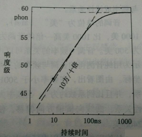 當(dāng)持續(xù)時(shí)間大于100ms的時(shí)候,響度級(jí)基本保持在60方;當(dāng)持續(xù)時(shí)間小于100ms時(shí),響度級(jí)隨著持續(xù)時(shí)間以大約每10倍時(shí)間10方的斜率下降:當(dāng)持續(xù)時(shí)間從100ms下降到10ms的時(shí)候,響度級(jí)大約從60方下降到50方。