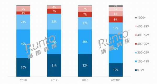 高端化布局已初具成效。根據(jù)洛圖科技(RUNTO)線上市場(chǎng)數(shù)據(jù)顯示,2021年上半年,中國(guó)智能音箱市場(chǎng)600元以上價(jià)格段份額達(dá)到8.1%,較去年同期增長(zhǎng)7.0個(gè)百分點(diǎn);1000元以上價(jià)格段份額達(dá)到2.4%,較去年同期增長(zhǎng)1.9個(gè)百分點(diǎn)。而200元以下價(jià)格段份額下降了7.4個(gè)百分點(diǎn)。