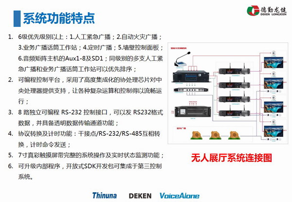 將展示區(qū)劃分為若干個分區(qū),當參觀人員進入分區(qū),觸發(fā)該區(qū)域的人體紅外探測器,紅外探測系統(tǒng)輸出控制信號(干接點信號),“公共廣播及音視頻播放管理系統(tǒng)”接收控制信號,控制在對應區(qū)域的宣傳設備(如高清音視頻播放器)播放宣傳資料內(nèi)容(例如宣傳片、音頻之類),播放時間可設定。音頻輸出給擴聲系統(tǒng),視頻可輸出給大屏幕顯示系統(tǒng)(如電視機,投影儀,LED屏等)。