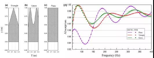 研究團隊在該理論方法的基礎(chǔ)上,對低頻吸聲體的幾何參數(shù)進行快速掃描,并結(jié)合遺傳算法對高斯曲面吸聲體的參數(shù)進行優(yōu)化,優(yōu)化后的三角形和高斯疊加曲面的吸聲體在低頻段體現(xiàn)了優(yōu)異的吸聲效果,相比平面結(jié)構(gòu)的吸聲性能得到了顯著提升(圖3)。