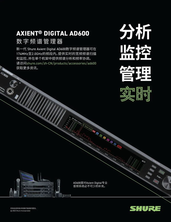 在當(dāng)今頻譜日益資源緊張的狀況下,Shure亦從未停止在頻譜領(lǐng)域的探索,不斷創(chuàng)新,力求實(shí)現(xiàn)一流的解決方案,AD600的推出就是對(duì)Axient Digital的進(jìn)一步強(qiáng)有力的補(bǔ)充和升級(jí),同時(shí)也是Axient Digital生態(tài)系統(tǒng)戰(zhàn)略升級(jí)中不可或缺的重要一步。