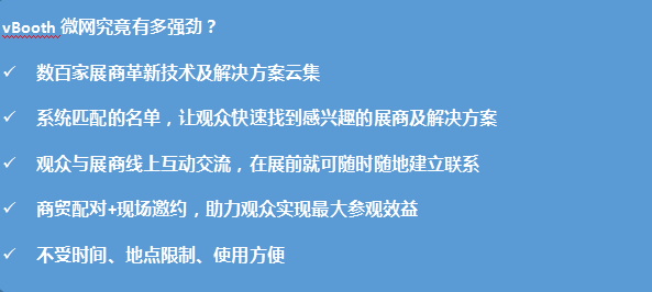 vBooth微網(wǎng),這是展會網(wǎng)站上提供給所有展商的專用頁面,將以圖片、文字、視頻等形式,讓觀眾全方位、直接地預(yù)覽到數(shù)百家展商的革新技術(shù)及解決方案。