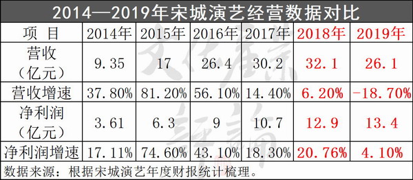 然而,作為國內(nèi)演藝第一股宋城演藝,占據(jù)了國內(nèi)旅游演出票房的半壁江山。從2015-2018年營收和凈利潤持續(xù)雙增長,復合增長率分別為21.49%和25.8%。其中,2018年公司實現(xiàn)營業(yè)收入高達31.2億元、凈利潤為12.9億元。2019年的營收下降至26.1億元,同比下降18.7%,但歸屬上市公司股東的凈利潤卻比2018年增長了4.1%。這是宋城演藝自上市以來首次出現(xiàn)營業(yè)收入負增長。