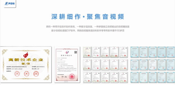 創(chuàng)新能力用成果說話:先后研發(fā)出中國第一臺數(shù)字音頻處理器、第一款音頻處理器DSP軟件著作軟件、一種多路音頻同步傳輸電路發(fā)明;獲得擁有一種用于拾音環(huán)助聽系統(tǒng)、一種數(shù)字混音器、一種多路獨立音頻輸出的音頻播放器、數(shù)字音頻處理器DSP軟件、網(wǎng)絡音頻服務器控制軟件等專利軟件著作100多項,為各行各業(yè)提供多種整體解決方案,榮獲專精特新企業(yè),實至名歸。