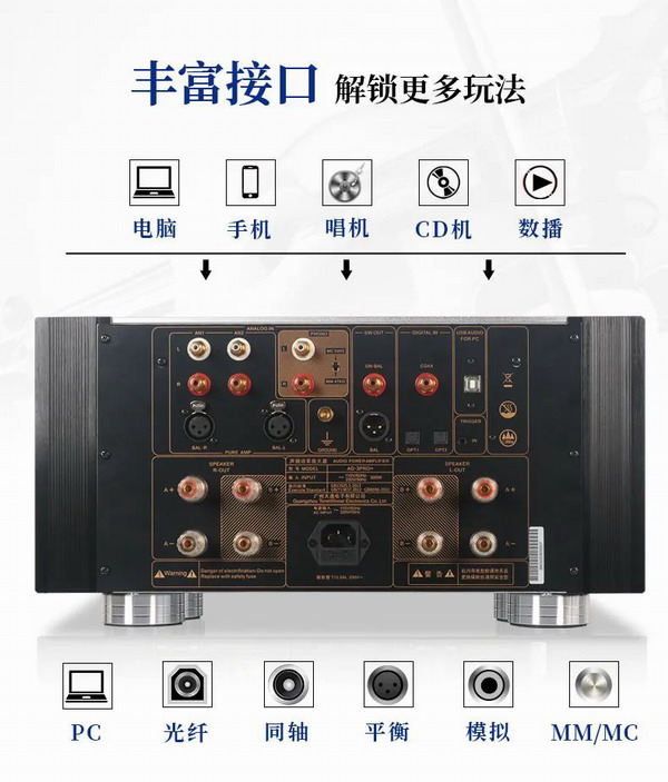 擁有Phono唱機接口,兼容動圈和動磁兩種黑膠唱頭,展現(xiàn)高雅品味與情懷