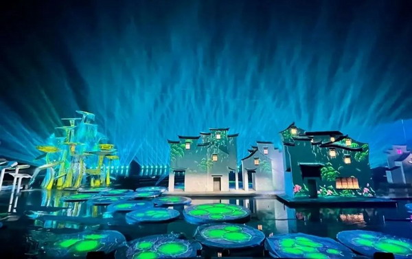 除了《遇見(jiàn)·婺源》,在景區(qū)制高點(diǎn)抱玉塔上演的奇幻Mapping秀《天工開(kāi)物》也值得一看,這是從古人智慧中獲得靈感而創(chuàng)作的光影藝術(shù),利用裸眼3D形式將歷史傳說(shuō)娓娓道來(lái)。