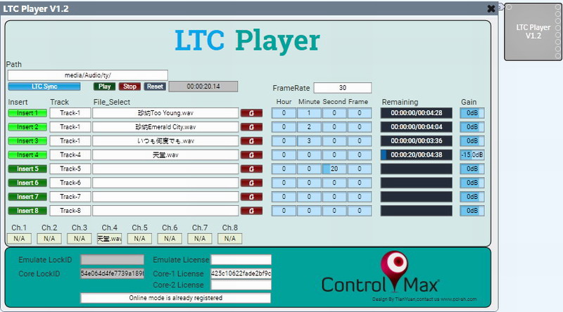 演出控制系統(tǒng)包含時(shí)碼音頻播放軟件Control Max “LTC Player”。其作為演出控制系統(tǒng)的子軟件,可提供最大32軌、128軌音頻文件在不同的時(shí)碼段,按預(yù)設(shè)音量進(jìn)行播放。