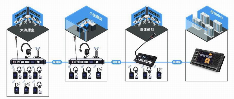 常規(guī)情況下演播室、直播間、微課室各自獨立工作,通話系統(tǒng)彼此獨立,主機無線信號可做到全層無線覆蓋,無懼實體墻遮擋;制作大型欄目需要轉(zhuǎn)場時,可打通每個演播室內(nèi)導(dǎo)播、攝像與主持人等多個崗位之間聯(lián)絡(luò),進入?yún)f(xié)同指揮聯(lián)動通話模式,形成一套靈活有效的內(nèi)部通話系統(tǒng)。