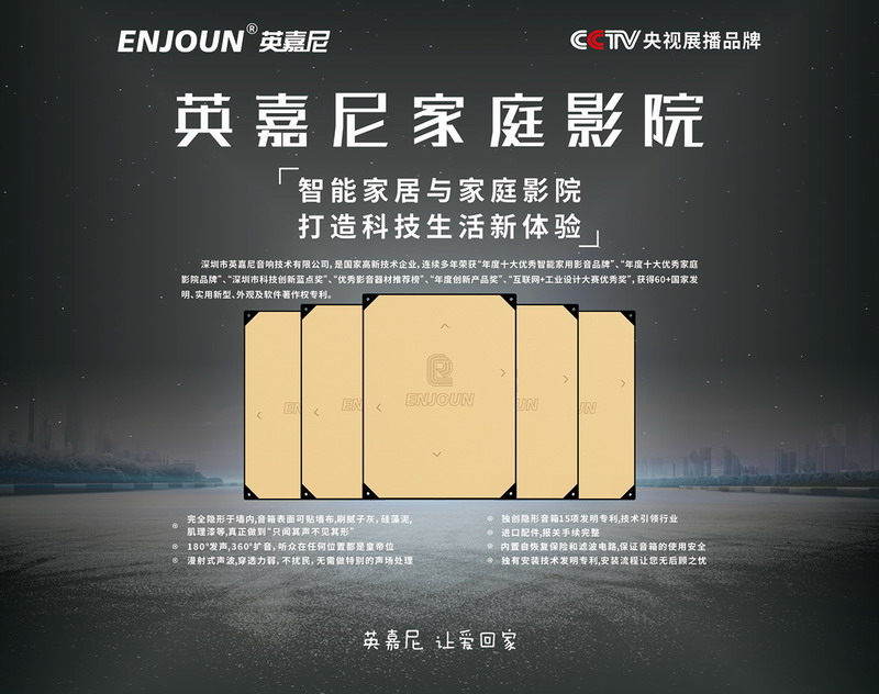 ENJOUN英嘉尼智能家庭影院這個品牌創(chuàng)立于2009年,以顛覆傳統(tǒng)、創(chuàng)新研發(fā)的“隱形音箱”廣為人知。隱形音箱源自英國NXT技術(shù),創(chuàng)新采用驅(qū)動器驅(qū)動蜂窩面板發(fā)聲,音箱厚度僅2.9cm,聲音呈180度均勻擴散,360度聆聽無死角,也就是業(yè)界說的“到處都是皇帝位”。