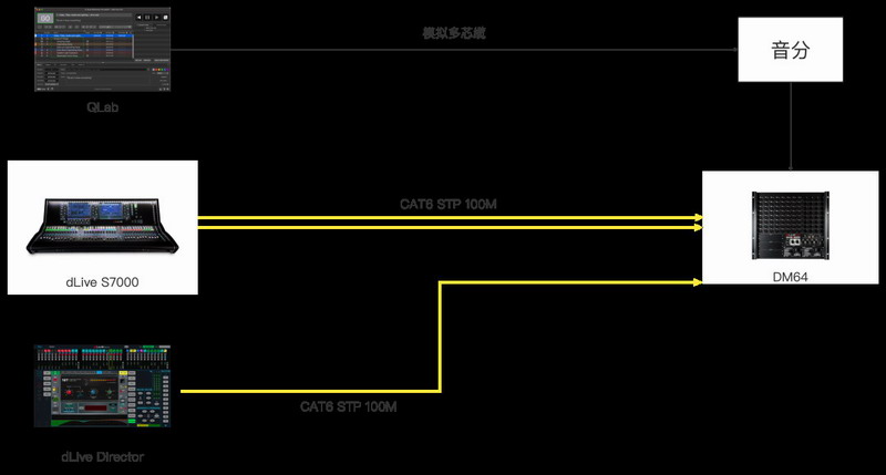 本次活動FOH調(diào)音臺使用了一張dLive S7000臺面搭配一臺DM64混音機架,S7000和DM64使用兩根網(wǎng)線進行冗余連接。為確保安全性,另外從DM64混音機架位置至FOH調(diào)音臺位置單獨接了一根網(wǎng)線,將這第三條網(wǎng)線直接與Macbook連接,使用dLive Director作為備份調(diào)音臺。
