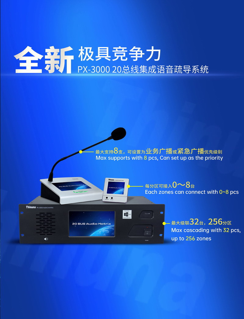 同時我們帶來了PP-6284 II 8x4多功能矩陣廣播一體化廣播主機。PX-3000多功能矩陣廣播系統(tǒng),最大支持256分區(qū)。同時隆重發(fā)布全新一代網(wǎng)絡(luò)音頻管理系統(tǒng)IP-9600 III,本系統(tǒng)全面支持IP,SIP,Onvif協(xié)議,是全新一代融合通信音頻產(chǎn)品,可以與任何第三方平臺進行對接,可以與監(jiān)控系統(tǒng),IP電話系統(tǒng)進行無縫兼容,相較于傳統(tǒng)公共廣播系統(tǒng),德勤龍健的公共廣播產(chǎn)品加強數(shù)字音頻信號處理的應(yīng)用,具有全面的故障備份檢測功能,支持更多平臺協(xié)議系統(tǒng)的融合通訊。全新發(fā)明專利的矩陣技術(shù)及網(wǎng)絡(luò)功放倒備技術(shù)將在我們這次展品中得到體現(xiàn),德勤龍健的產(chǎn)品已經(jīng)進入軌道交通,機場等要求最苛刻的應(yīng)用場所。