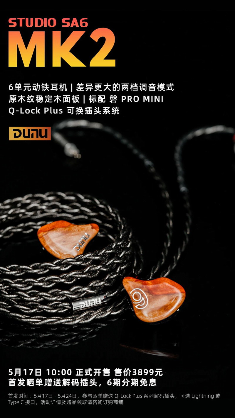 SA6 MK2 將于5月17日10:00正式開(kāi)售,售價(jià)3899元,與一代一致,首發(fā)曬單贈(zèng)送Q-Lock Plus 系列解碼插頭一個(gè)(可選Type C或Lightning接口,活動(dòng)詳詢訂購(gòu)店鋪),分期可享6期免息。