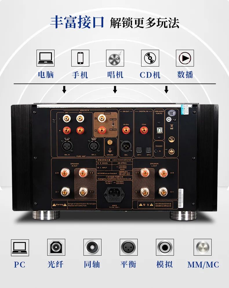 AD-2PRO+背板增加了USB-Audio接口,搭配頂級芯片CT7601PR,使本機支持DSD 512并向下兼容的數(shù)字音頻格式,以及768KHz/32bit的超高采樣率。此外,AD-2PRO+的功率也有原先的每聲道200W(8Ω)穩(wěn)定提升為每聲道240W(8Ω)。