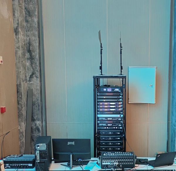 2只超重低音音箱,安裝于主席臺兩側(cè),為整個會場提供低音擴聲,2只返聽揚聲器按照舞臺位置,為舞臺上人員演出提供擴聲。