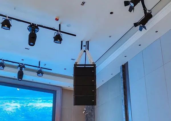左右兩串線陣4只線陣音箱,在舞臺兩側(cè)上方,4只輔助音箱采用壁裝方式,壁掛在宴會廳兩邊,主要負責中前場區(qū)域的擴聲。