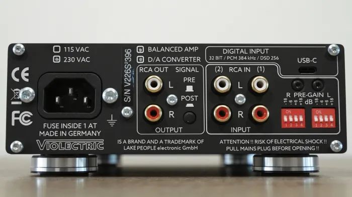 在背面,我們發(fā)現(xiàn)最左邊的電源插座顯示了該裝置的電壓設(shè)置,230V或115V。然而,這可以在V226內(nèi)部手動切換。電源插座后面是RCA輸出和前置/后置按鈕。右側(cè)是可以在前面選擇的輸入,因此,RCA 1、RCA 2和用于數(shù)字USB輸入的USB-C插座。在USB插座下面是預(yù)增益開關(guān),我很喜歡這些。這些DIP開關(guān)允許用戶為每個通道設(shè)置耳機(jī)放大器預(yù)增益,并提供七種設(shè)置;0dB、-18dB、-12dB、-6dB、+6dB、+12dB和+18dB。注意:要實(shí)現(xiàn)-12dB,需要打開(向上)-18dB和+6dB開關(guān),而對于+12dB,則需要打開(向上)+18dB和-6dB開關(guān)。