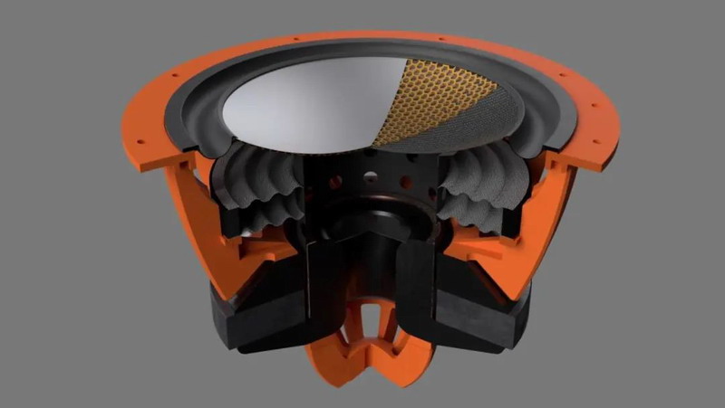 中音也采用全新的4吋RDT III(Rigid Diaphragm Technology III)錐盆單體,原廠表示它是自家失真很低的中音。同樣是采用招牌的三明治結(jié)構(gòu),從外到內(nèi)以C-CAM鋁鎂合金材質(zhì)、Nomex結(jié)構(gòu)和碳纖維材質(zhì)構(gòu)成,不同的是在原有的結(jié)構(gòu)后方又多加了一層碳纖維蒙皮,能讓單體的剛性更強(qiáng),降低盆分裂失真。同時RDT III也在錐盆的邊緣與單體懸邊結(jié)構(gòu)上進(jìn)行優(yōu)化,振膜后方也采用著名的DCF(Dynamic Coupling Filter)橡膠阻尼環(huán)搭配強(qiáng)力釹磁鐵驅(qū)動,使此代喇叭的中頻更線性、瞬時效果也更靈敏。