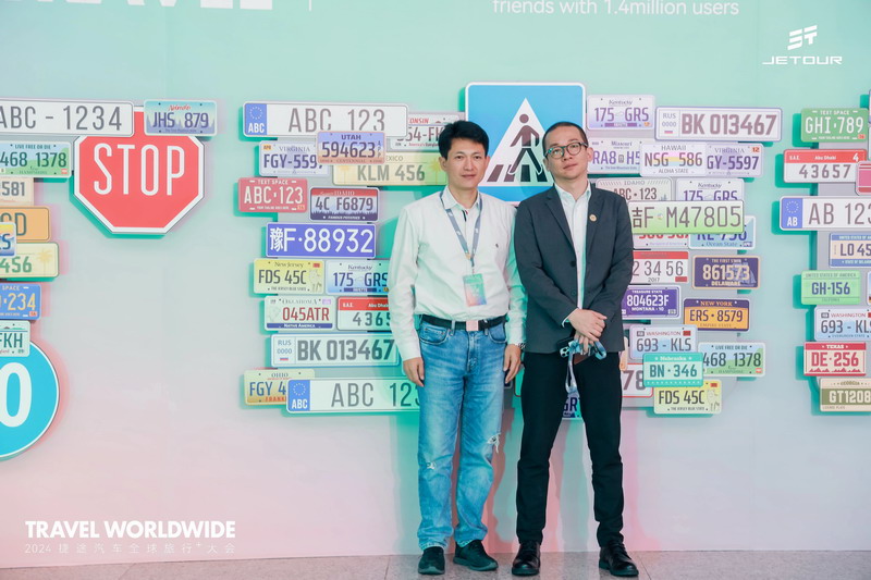 捷途品牌事業(yè)部營(yíng)銷中心副總經(jīng)理王陽(yáng)與合作伙伴在捷途世界車牌故事墻前合影留念