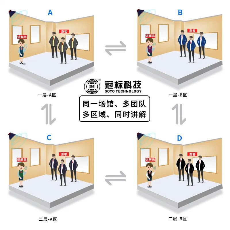 講解員攜帶冠標科技無線講解器,帶領游客前往歷史展廳。講解員所到之處,該區(qū)對應的播放設備快速響應,自動連接并開始工作。講解員離開后,播放設備自動斷開連接。多區(qū)域、多講解器之間互不串頻。