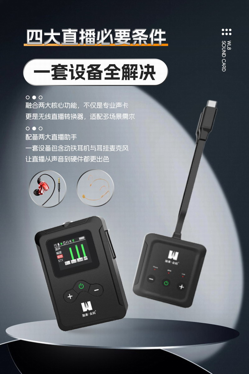 直播設(shè)備繁瑣難選?音效不夠?qū)I(yè)?功能不夠齊全?加來眾科 WL8 無線直播云聲卡,懂你所需,一機(jī)搞定!融合多種功能,內(nèi)外兼修,重新定義直播設(shè)備的專業(yè)標(biāo)準(zhǔn)!