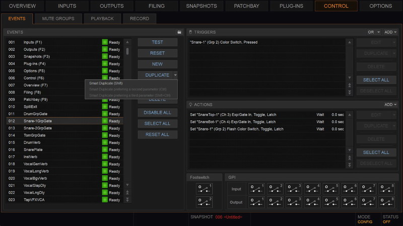 每次重大版本發(fā)布,我們都會對事件(EVENTS)系統(tǒng)進行擴展。我們新增了大量新的觸發(fā)器(Triggers)和操作(Actions),其中大部分源自 “OPTIONS” 標簽頁!癘PTIONS” 標簽頁中的幾乎所有內(nèi)容都可作為觸發(fā)器(Triggers)或操作(Actions)使用,尤其值得一提的是“在SOF中VCA調(diào)節(jié)Aux發(fā)送”,它能讓你快速切換該設置,允許您在需要時使用在推子上發(fā)送中VCA 去調(diào)節(jié)的混音。